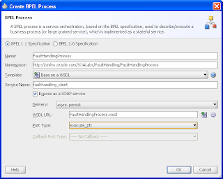 1. Create a new SOA project with name "FaultHandling".Drag and drop BPEL process onto the components lane.Pop will open up, give BPEL process the name "FaultHandlingProcess" and in tmplate select "Base on a WSDL".
